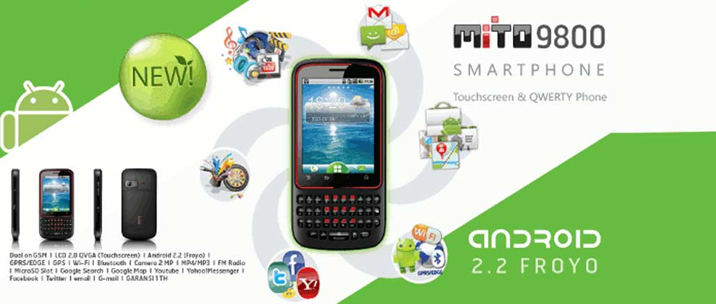 Konsep yang ditawarkan ponsel Android Mito ini terbilang cukup menarik. Pasalnya, selain didukung layar sentuh (touchscreen) berukuran 2.8 inci TFT QVGA, Mito 9800 juga dibekali keypad QWERTY ala BlackBerry. Untuk panel navigasi menu, ponsel ini menghadirkan tombol sentuh khas ponsel Android. Di sisi bodi, Mito 9800 menanamkan beberapa tombol fungsi (volume, kamera, power), port kabel data microUSB, port audio jack 3.5mm yang strukturnya mengadopsi konsep BlackBerry.